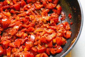 Währenddessen bereitet man das Gemüse vor, indem man Zwiebeln, Paprikaschoten und Knoblauch würfelt und anbrät. Anschließend wird das Tomatenmark hinzugefügt und mitgebraten. Dann kommen die Paprikawürfel hinzu und werden einige Minuten lang angebraten.