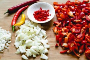 - Die Chilischote der Länge nach halbieren, die Kerne entfernen und fein hacken. Die Paprikaschoten entkernen und in Würfel schneiden. Die Zwiebeln ebenfalls fein würfeln.