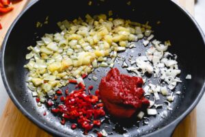 - Erhitze das Rapsöl in einer Pfanne und dünste die Zwiebelwürfel darin glasig an. Füge den gepressten Knoblauch, die gehackte Chilischote und das Tomatenmark hinzu und schwitze alles kurz an.